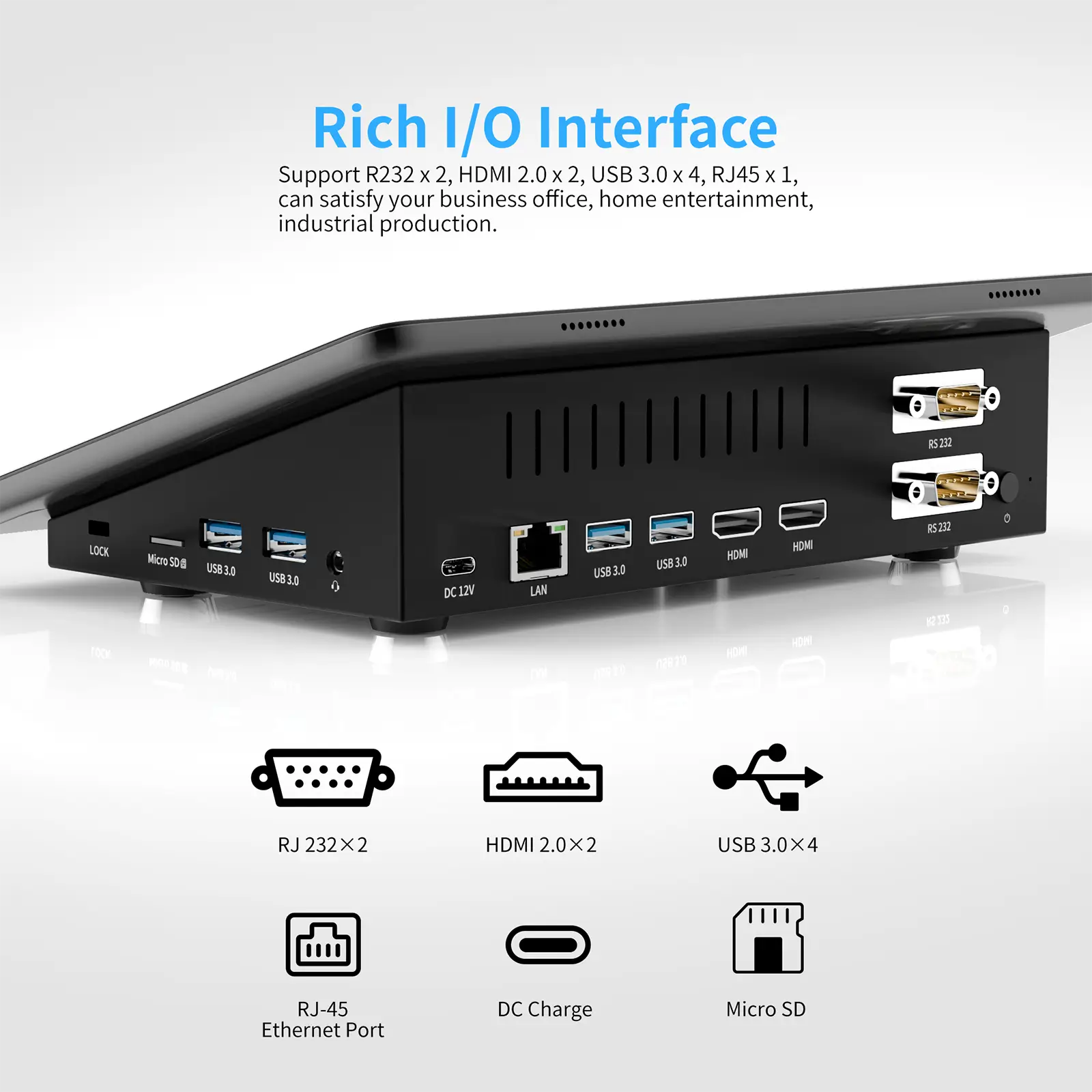 Multiple I/O Ports: Includes USB, HDMI, RS232, and more for seamless integration with other industrial equipment and peripherals.